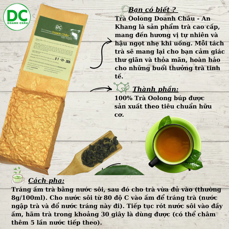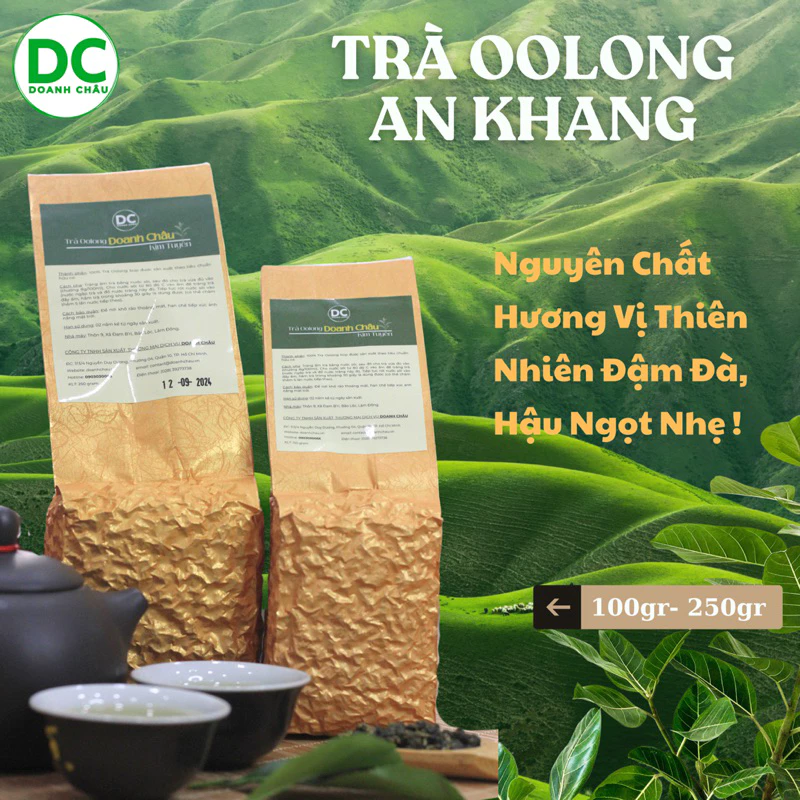Trà Oolong Doanh Châu An Khang là dòng trà hảo hạng mang hương vị đậm đà, tự nhiên cùng hậu vị ngọt nhẹ, thanh khiết. Được tuyển chọn từ những búp trà non Oolong Kim Tuyên trồng tại nông trường Bảo Lộc. Đây không chỉ là thức uống tinh tế cho những phút giây thưởng trà, mà còn là món quà ý nghĩa, gửi gắm lời chúc an khang, thịnh vượng đến người thân, bạn bè, đối tác và khách hàng.