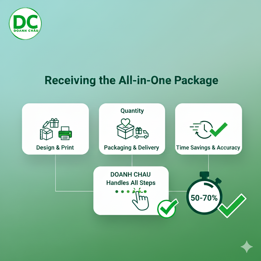 Tiết kiệm chi phí và thời gian cho doanh nghiệp với quy trình quà tặng đơn giản. Từ lựa chọn sản phẩm, thiết kế, in logo đến đóng gói và giao hàng—tất cả đều được Doanh Châu quản lý trọn gói trong một giải pháp duy nhất.